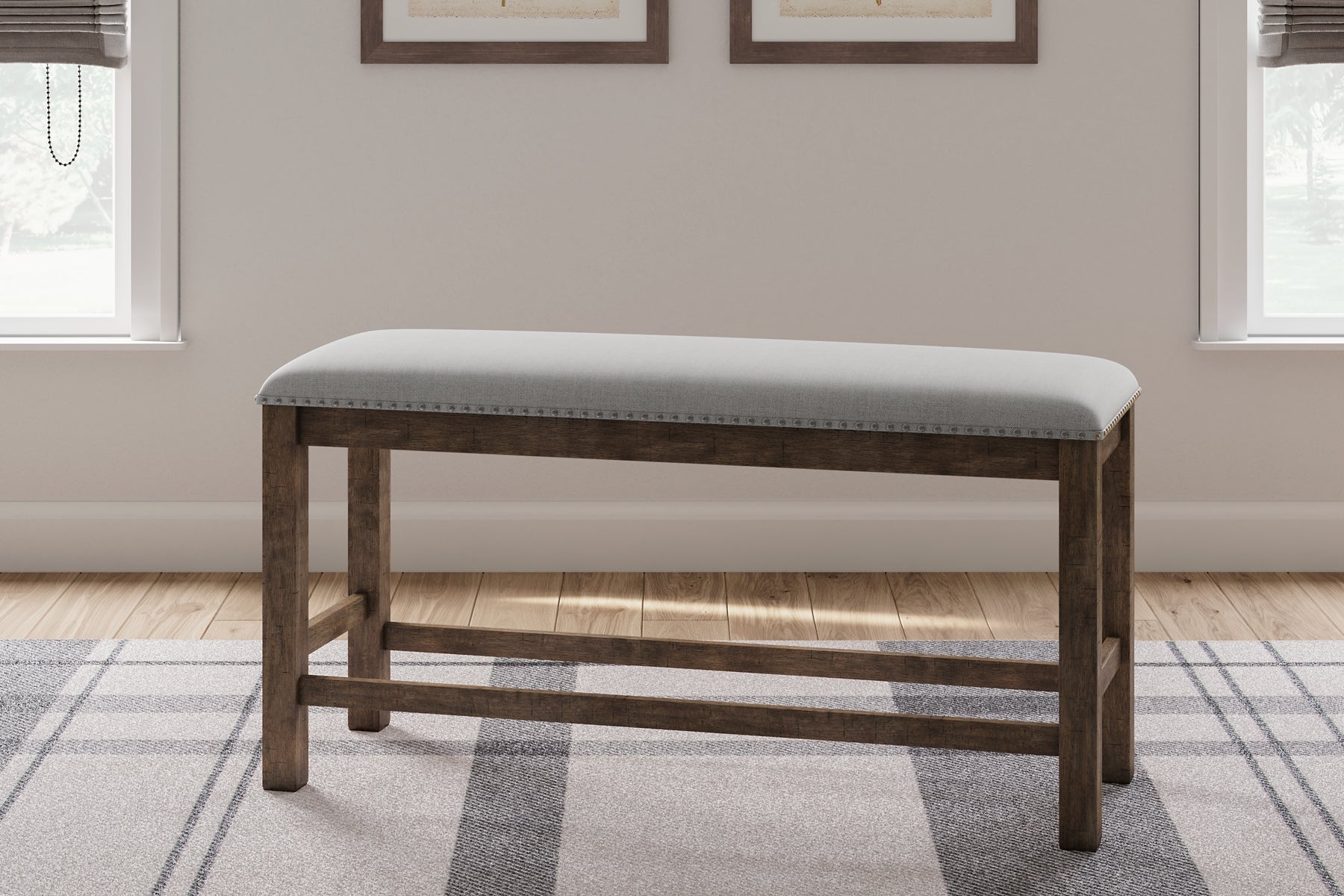This counter height upholstered bench might be simple at first sight, but a closer look reveals beauty in the details. With a distressed nutmeg finish, antiqued nailhead trim and textured polyester upholstery, it's beaming with charm. Cushioned seat ensures long, lingering meals are enjoyed in total comfort.