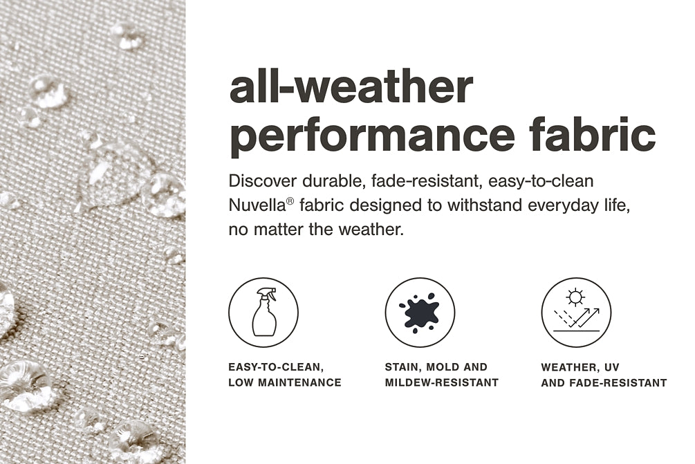 Details Set of 2, Made of HDPE material, Gray finish with textured wood look, Seat/back cushions covered in solution-dyed Nuvella® (polyester) high-performance fabric, All-weather foam cushion core wrapped in soft polyester, Clean fabric with mild soap and water, let air dry; for stubborn stains, use a solution of 4 oz. bleach to 28 oz. water, Imported fabric and fill, Assembly required